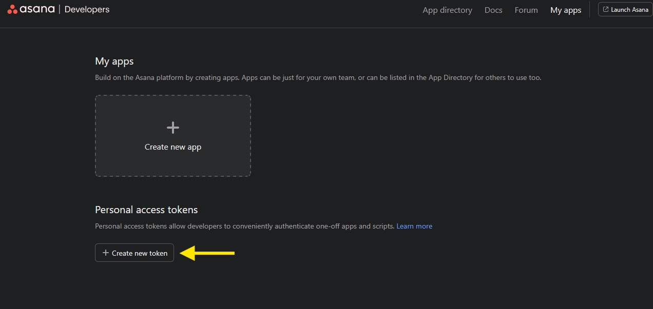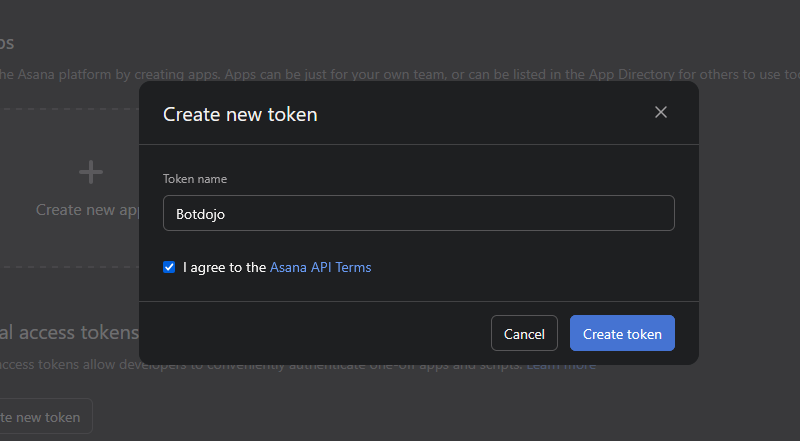 To connect Asana to BotDojo, you need an Asana Personal Access Token (PAT). You can create one in your Asana developer console.
