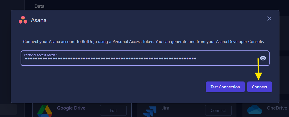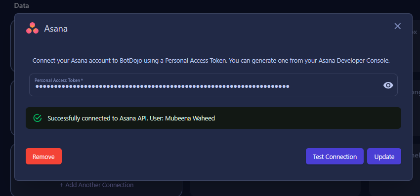- Paste Asana Personal Access Token in the provided field and click connect.
