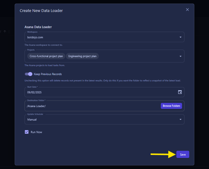 - Set Up Asana by selecting Workspace, Project, Date Range and click on Save button