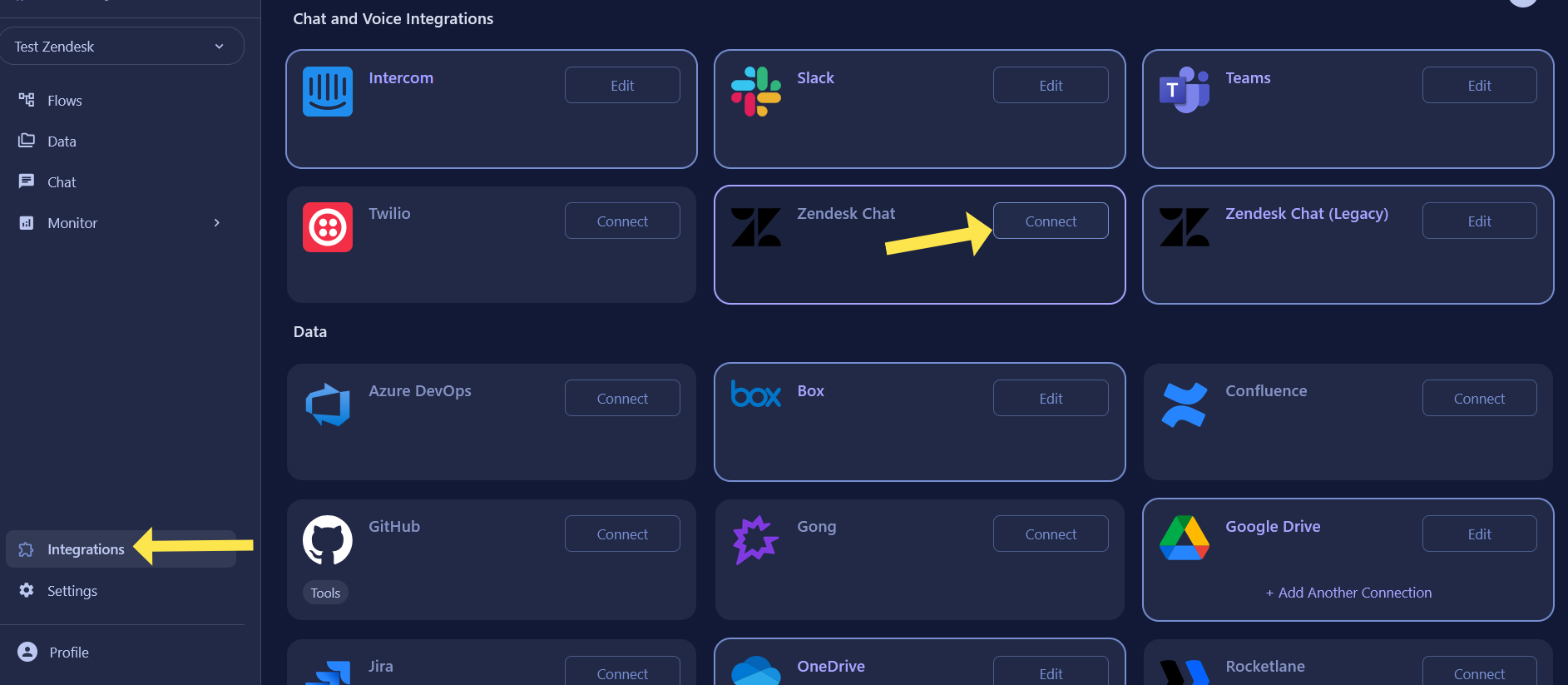 - Now navigate to your BotDojo account. From the integrations page, select the Zendesk Chat integration.
