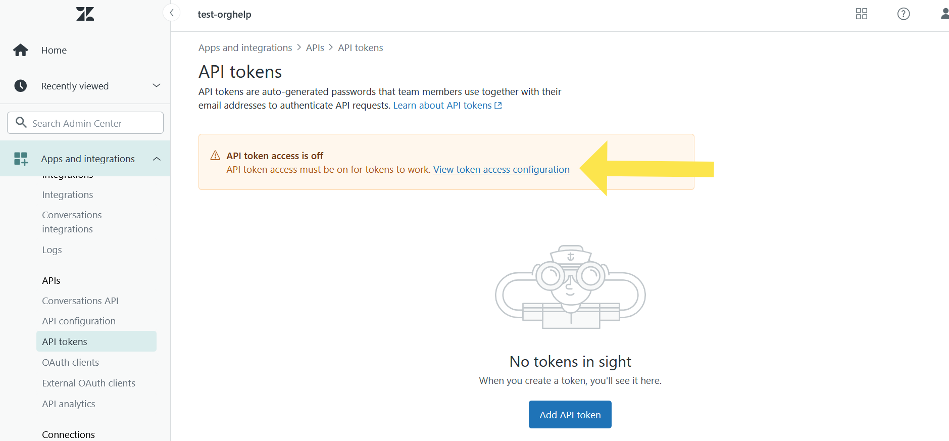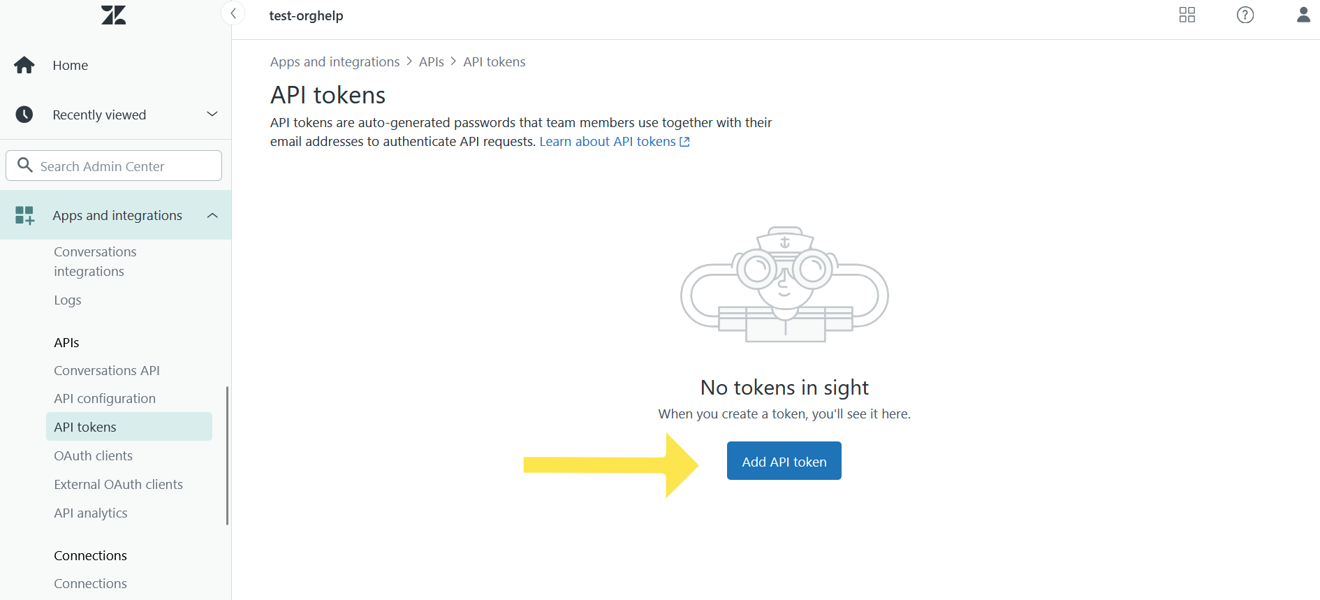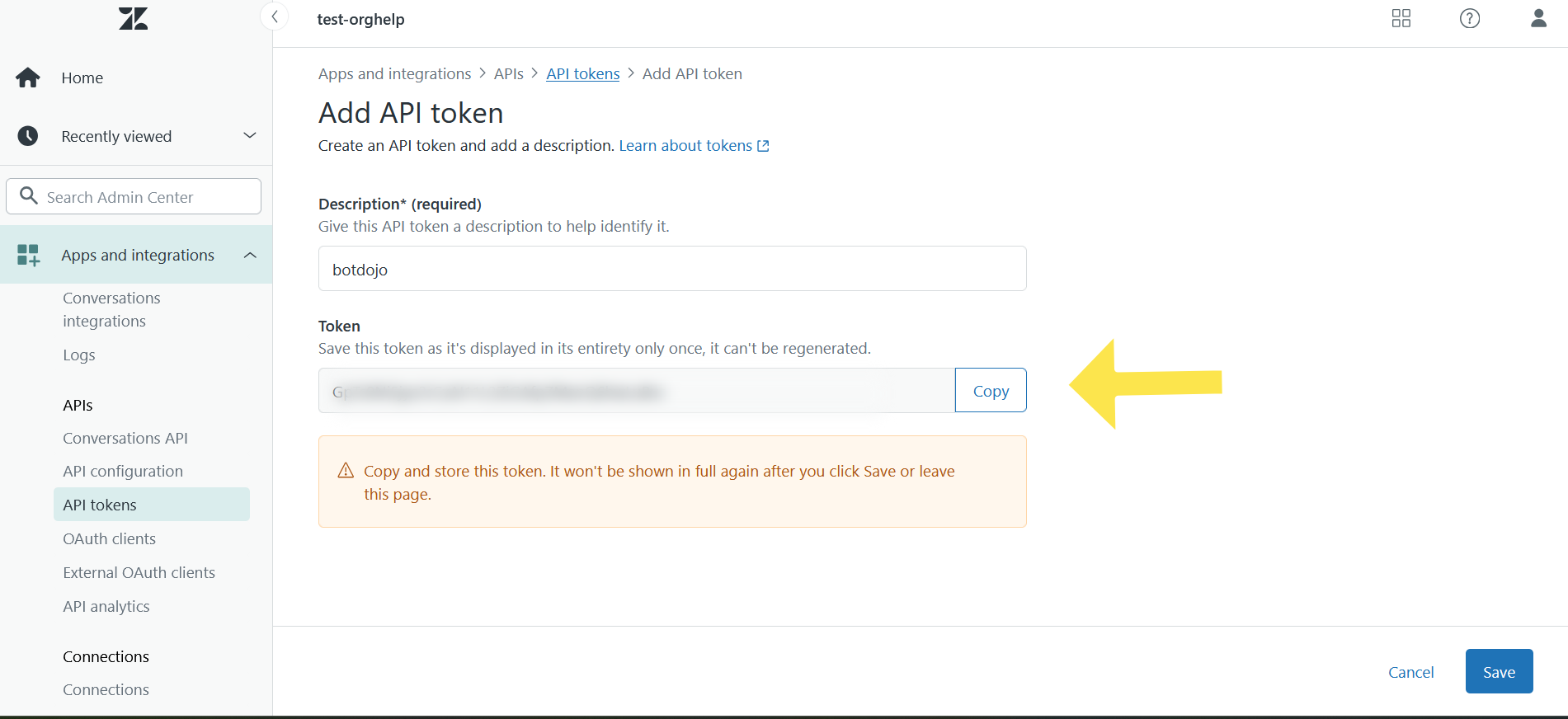 - Navigate back to your Zendesk Admin Center > Apps and Integrations > APIs > API tokens