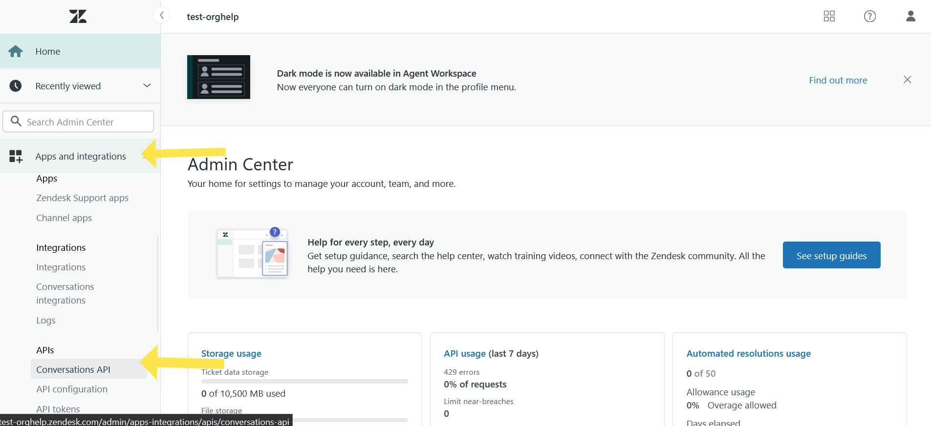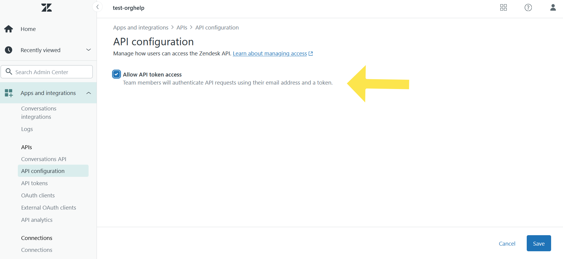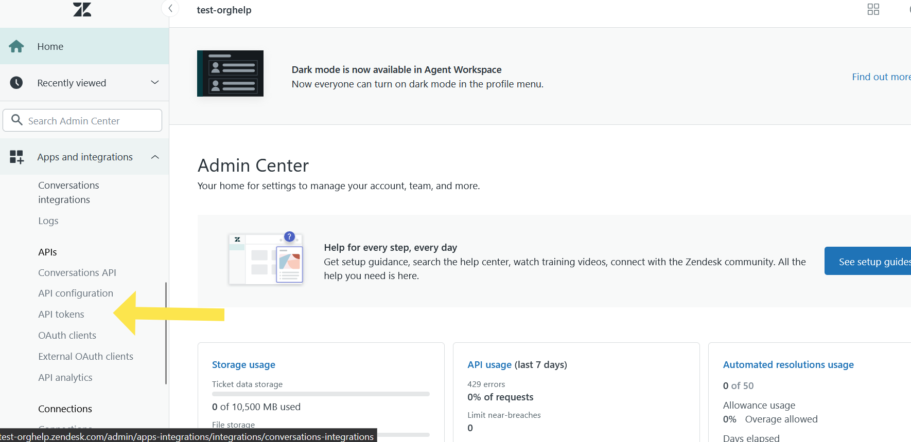 - Navigate back to your Zendesk Admin Center > Apps and Integrations > APIs > API tokens