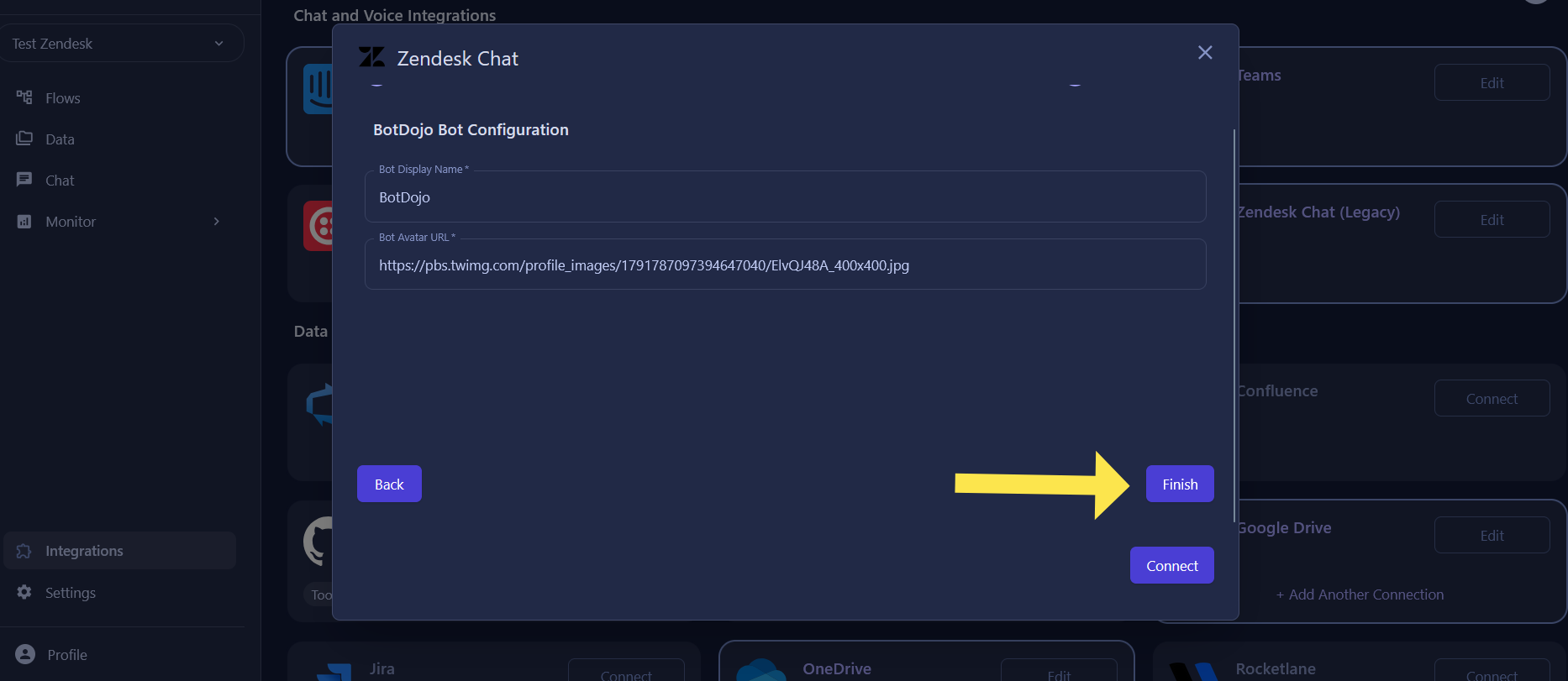 - In the BotDojo Bot Configuration section, you can set a Bot Display Name and Bot Avatar URL. The avatar URL must be a publicly available image. Once you've finished customizing the chatbot, click Finish.