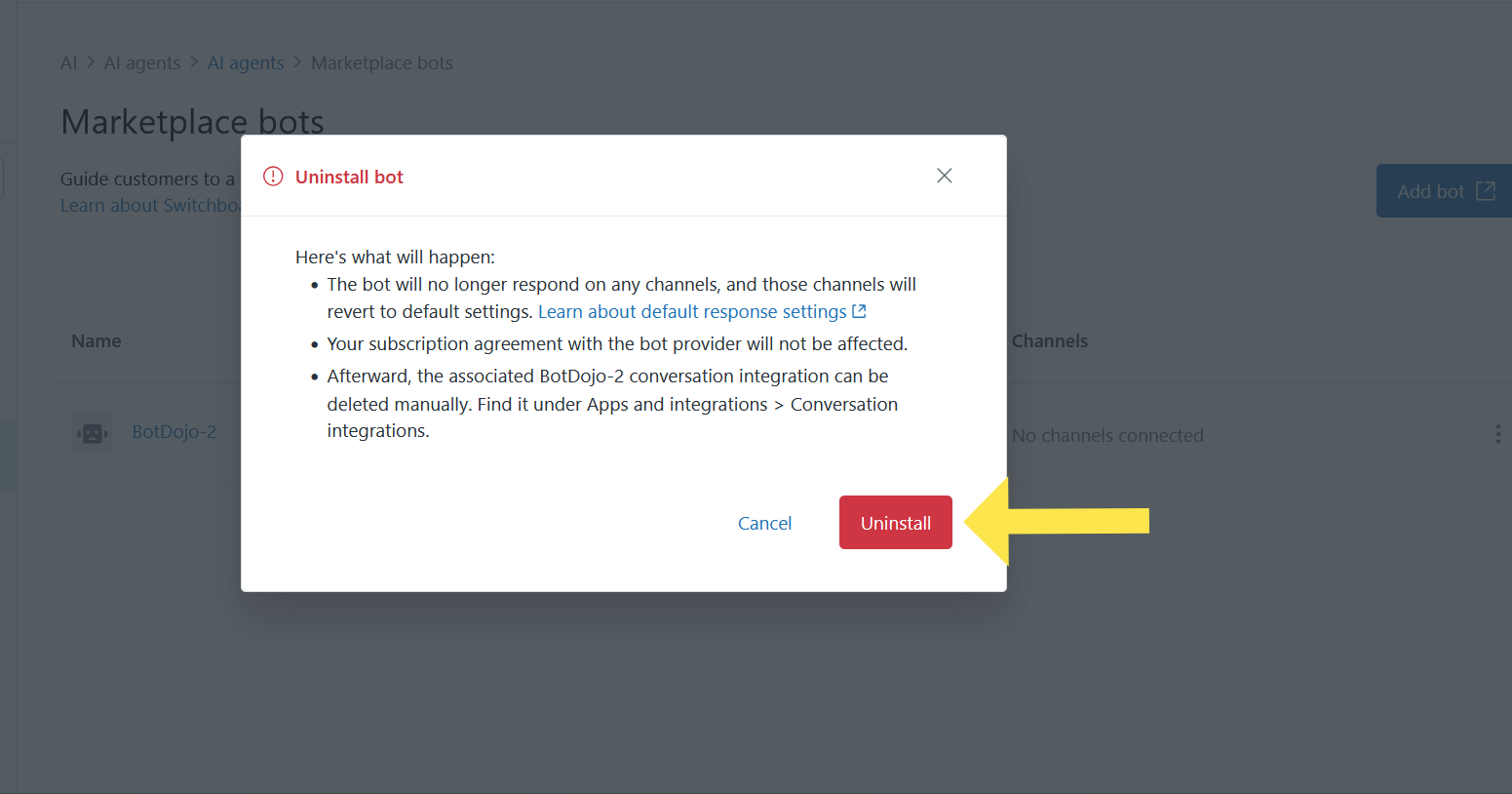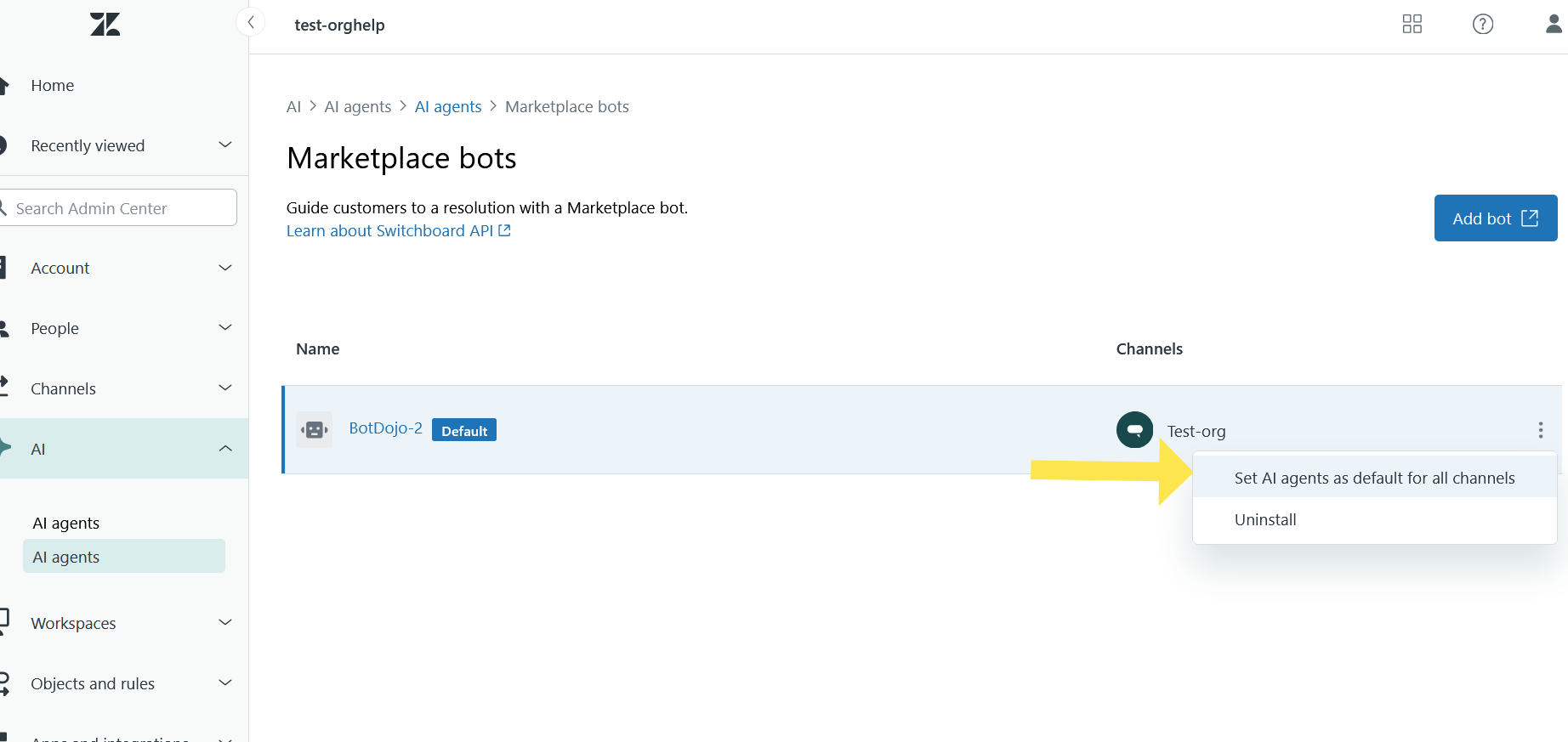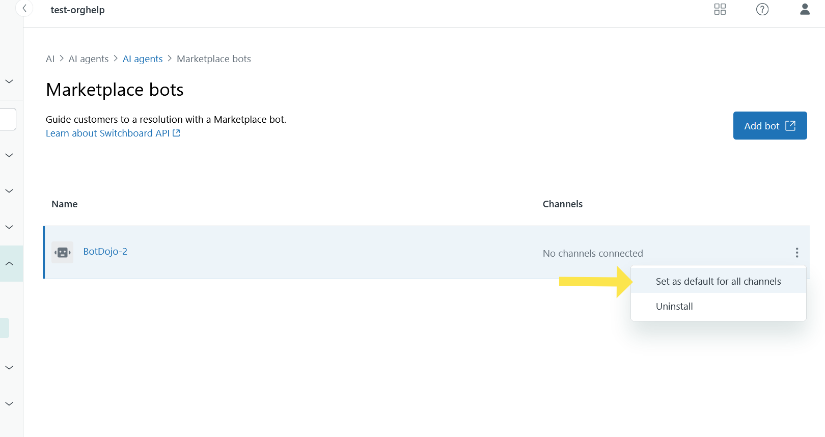 - First, you need to set another bot as the default responder. Navigate to Zendesk Admin Center > AI Agents > Marketplace Bots and select a different bot to be the default responder for your channels.