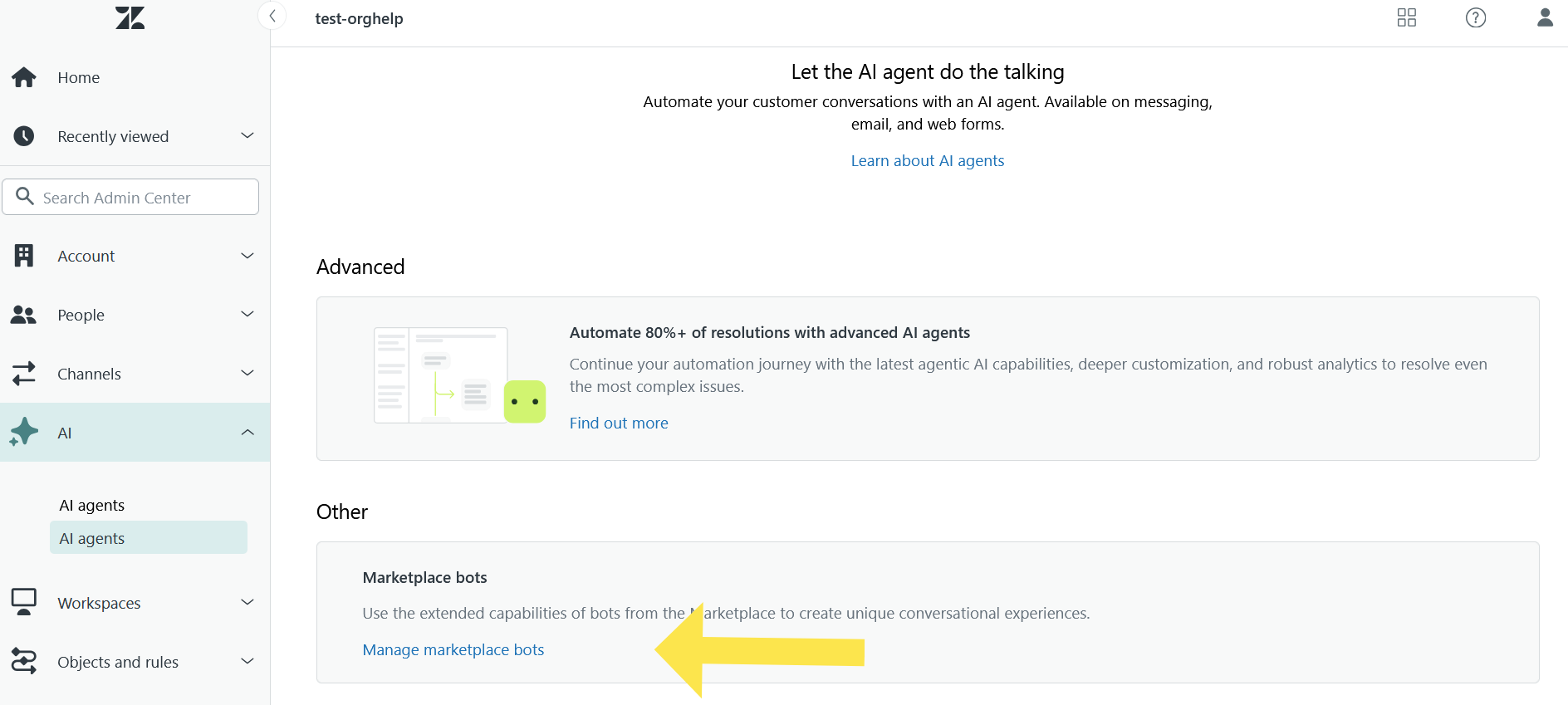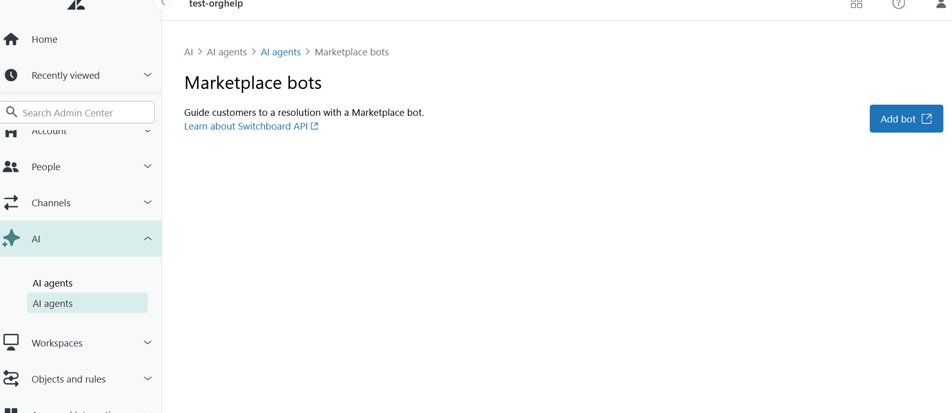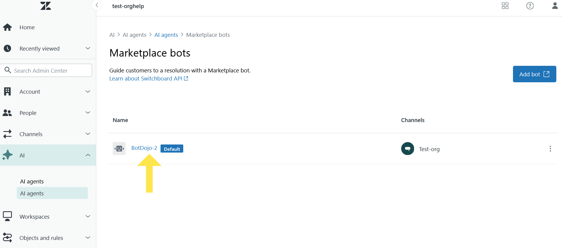 - First, you need to set another bot as the default responder. Navigate to Zendesk Admin Center > AI Agents > Marketplace Bots and select a different bot to be the default responder for your channels.