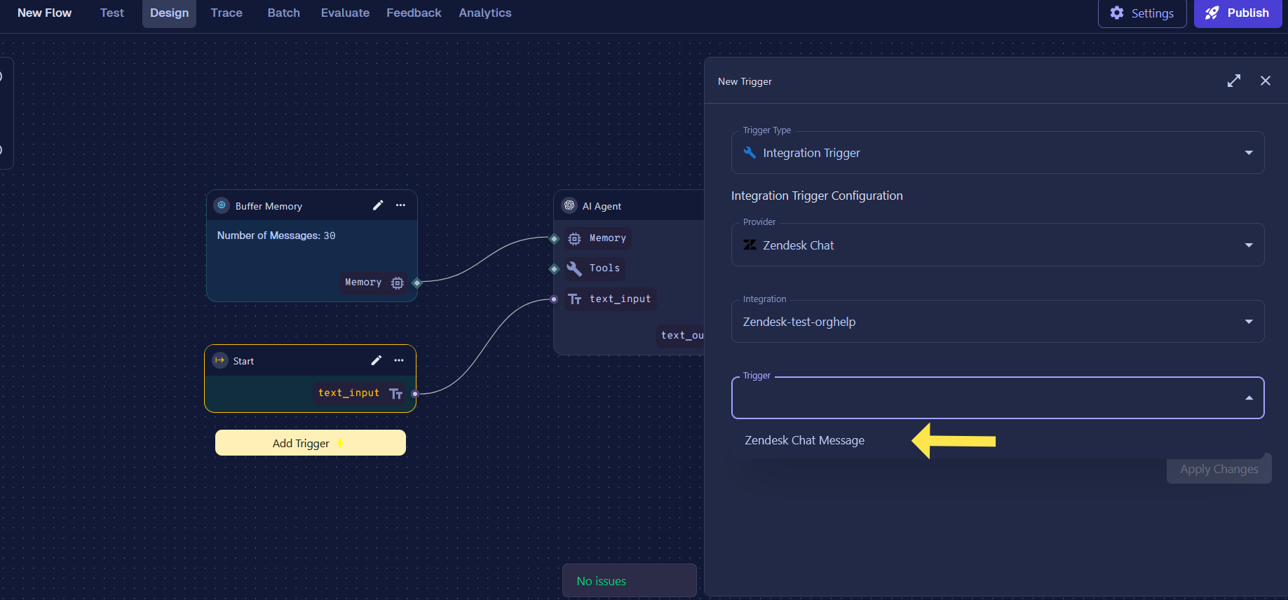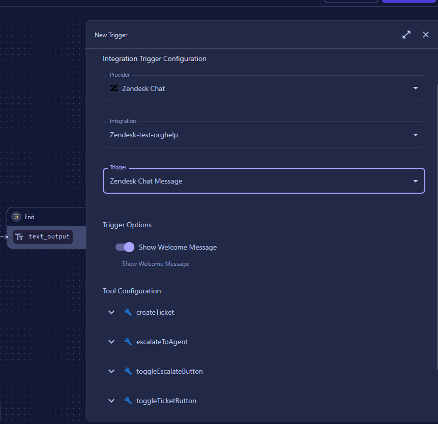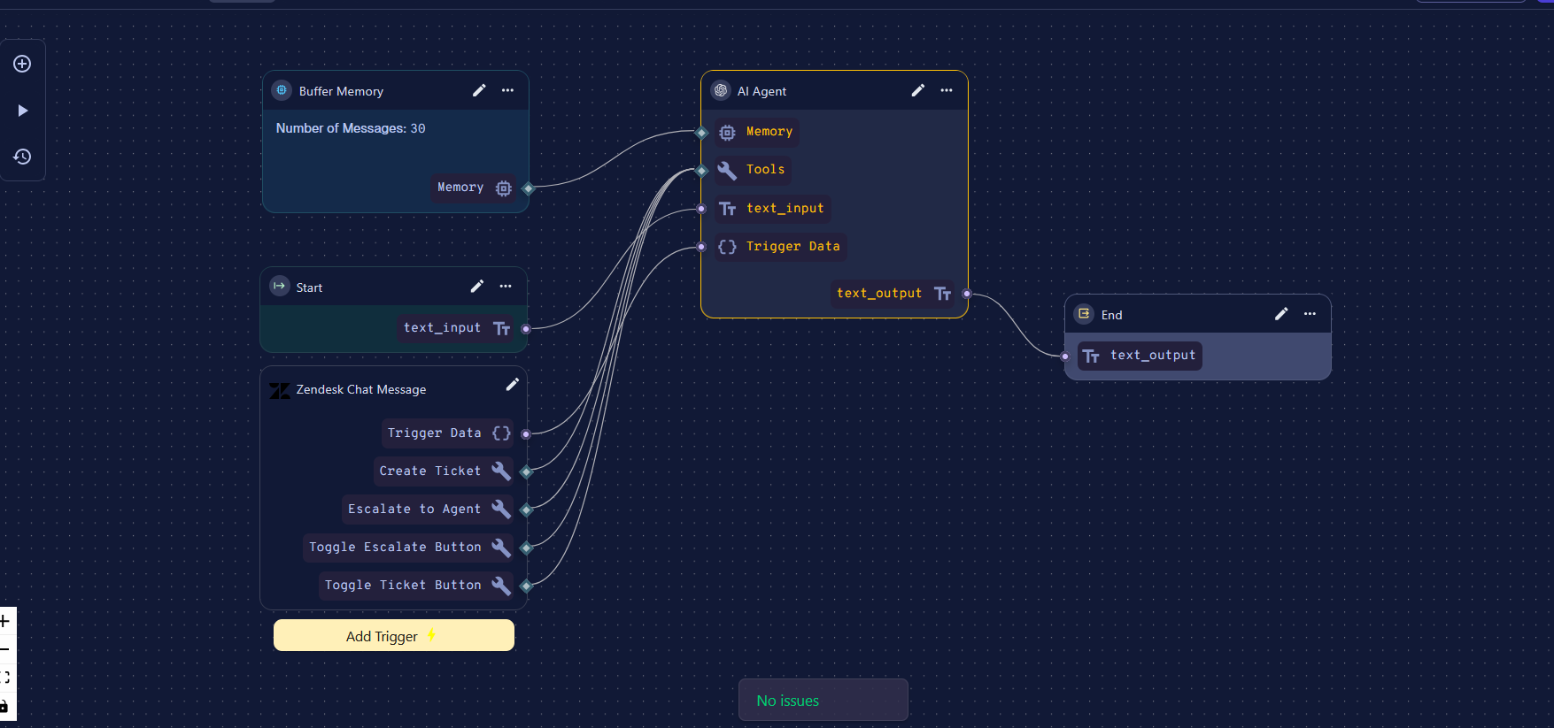 - Your Zendesk trigger is now successfully created. Configure the flow by mapping all the necessary inputs and tools to your Language Model.