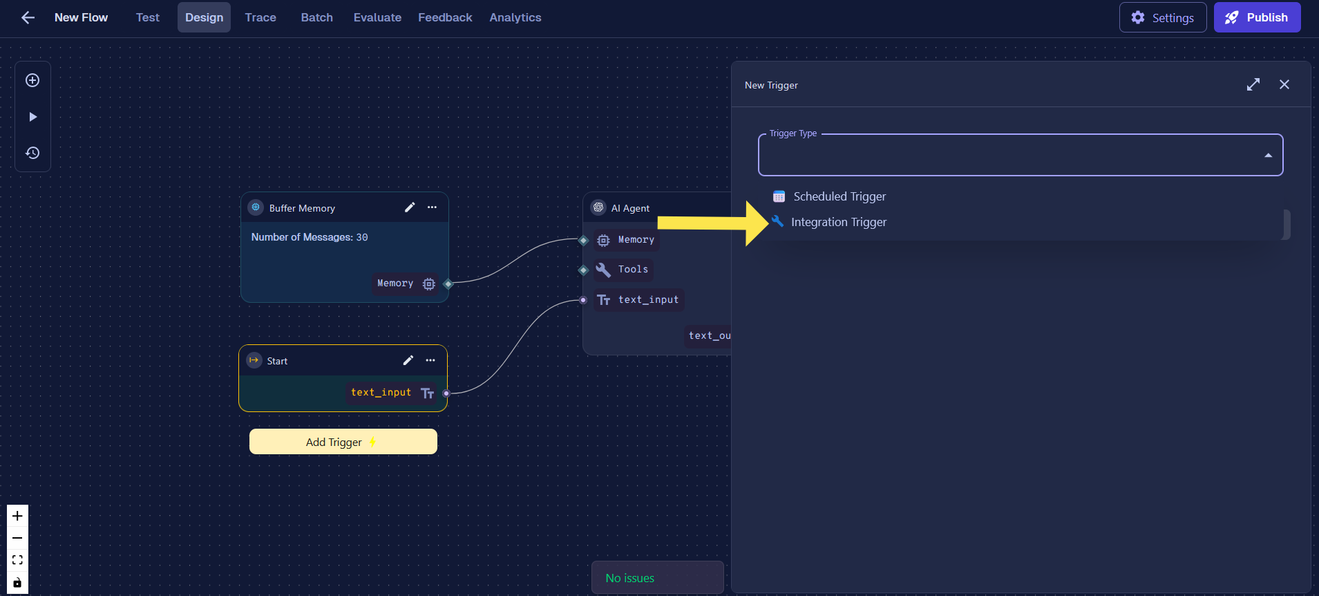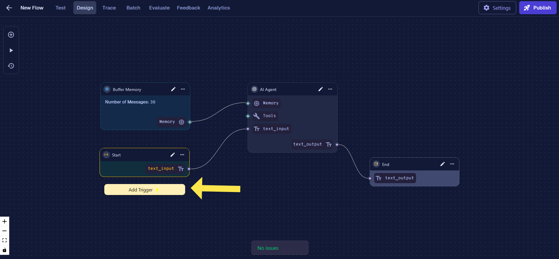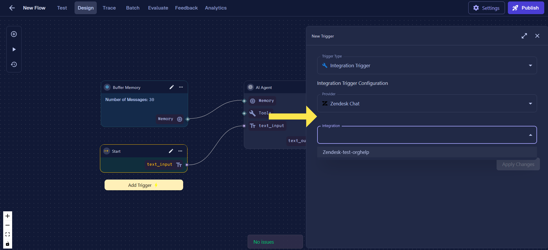 - Your Zendesk trigger is now successfully created. Configure the flow by mapping all the necessary inputs and tools to your Language Model.