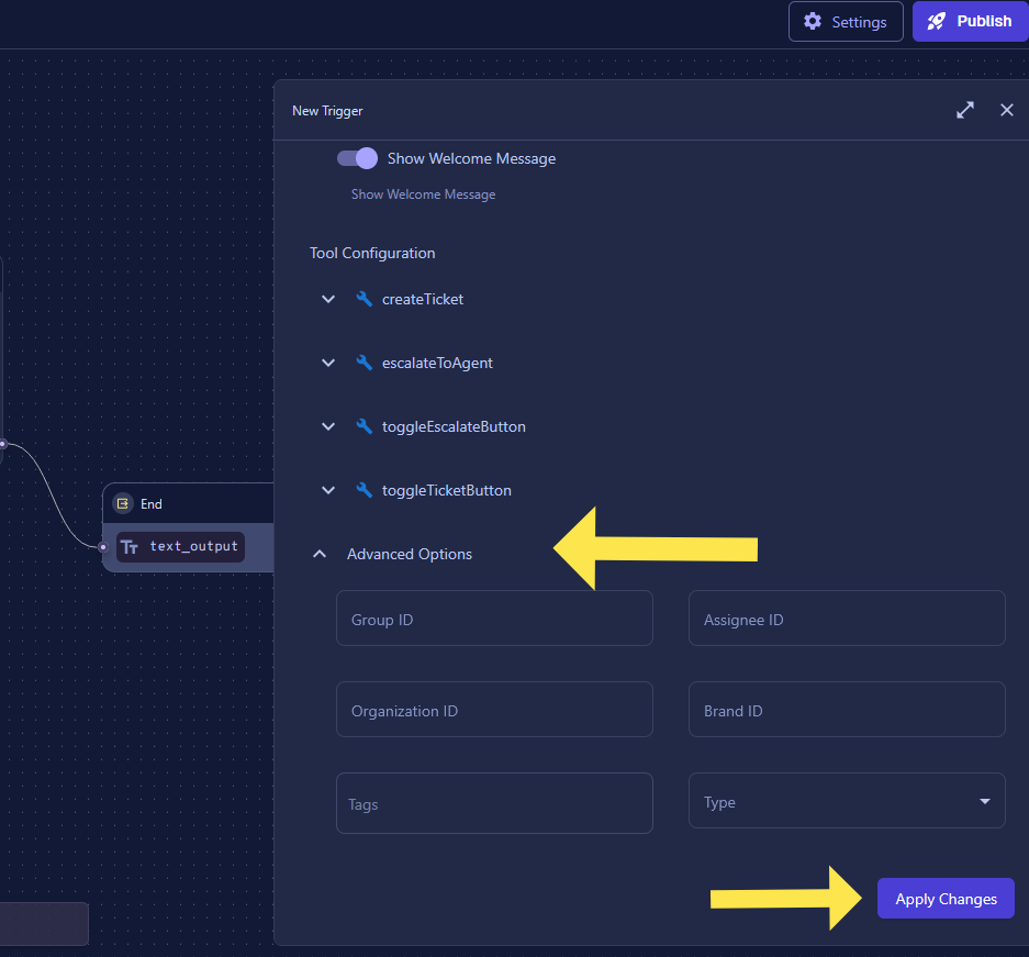 - You can customize ticket fields in the advanced options section. These fields will be used during ticket creation and agent escalation. Once configured, click Apply Changes
