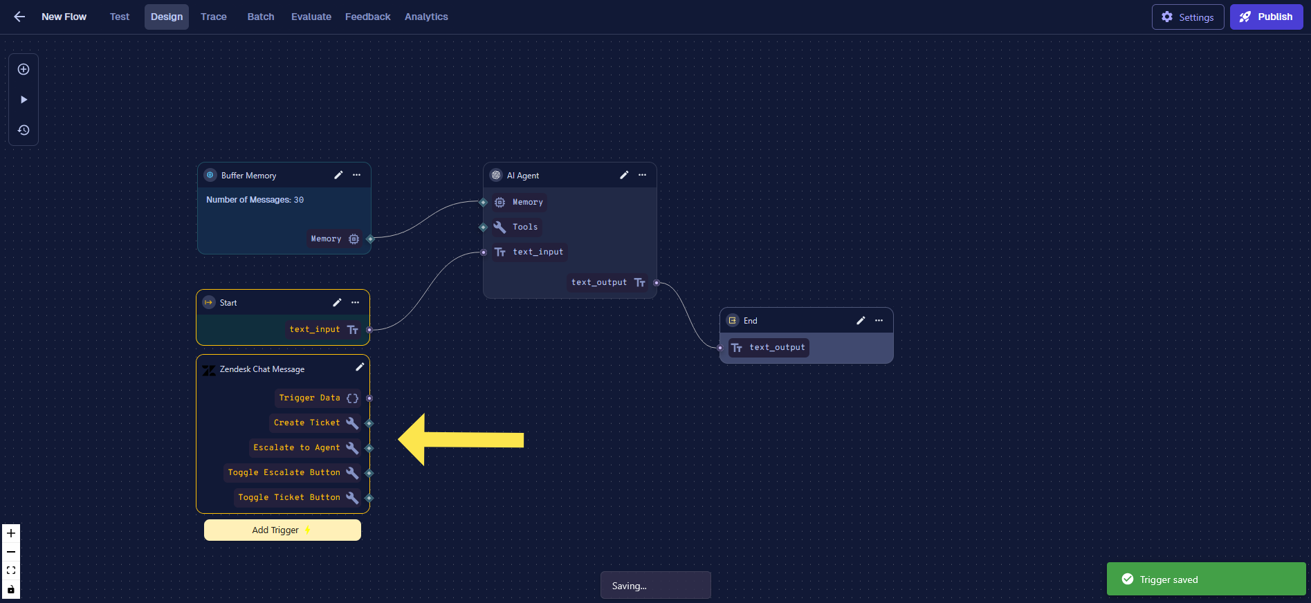 - The trigger has been successfully added to the flow. Now, whenever a new message arrives on any Zendesk channel, this flow will be triggered to handle the user query. The flow includes built-in capabilities to analyze user messages, create support tickets, and escalate conversations to human agents when needed.