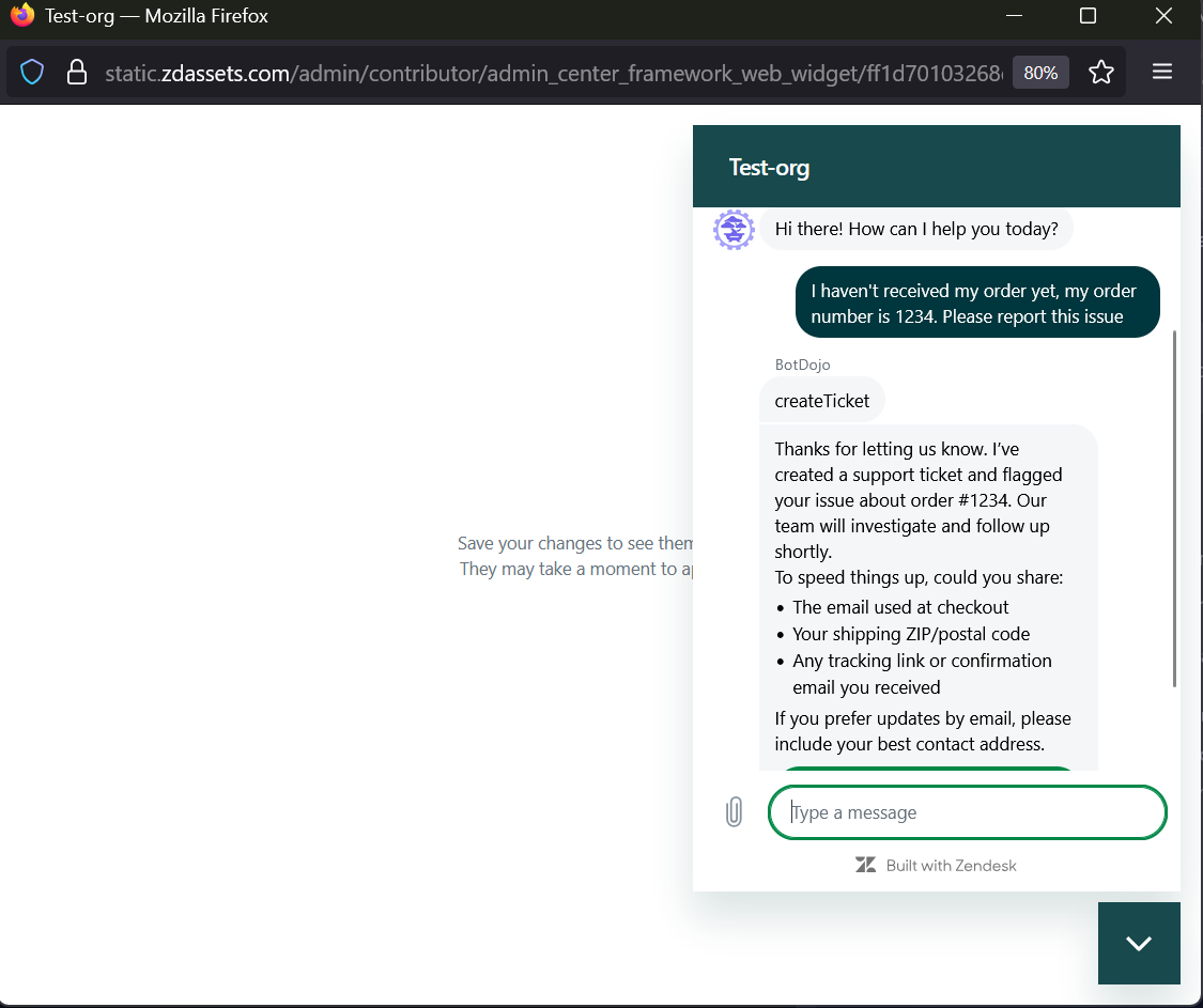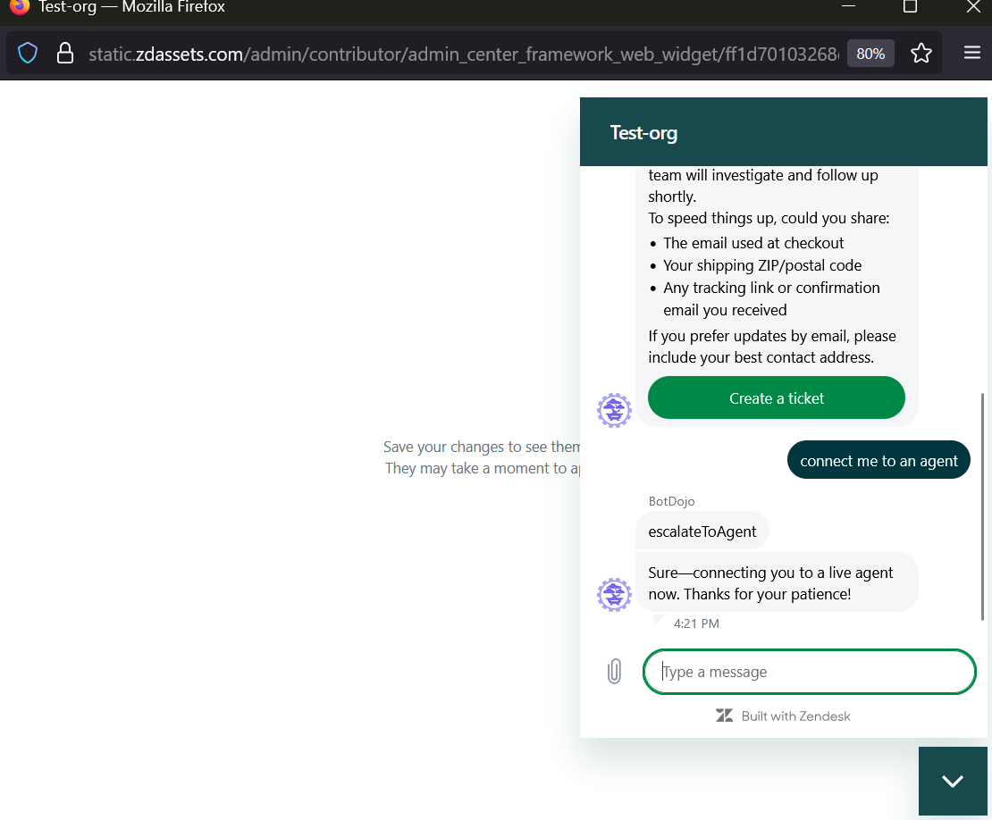 - Congratulations! You've successfully created your BotDojo integration in your Zendesk portal. You can verify the installation by navigating to the Zendesk Admin Center > AI Agents > Marketplace Bots. The newly created BotDojo integration will be listed there. To set this bot as the default responder on any channel, follow the subsequent steps.