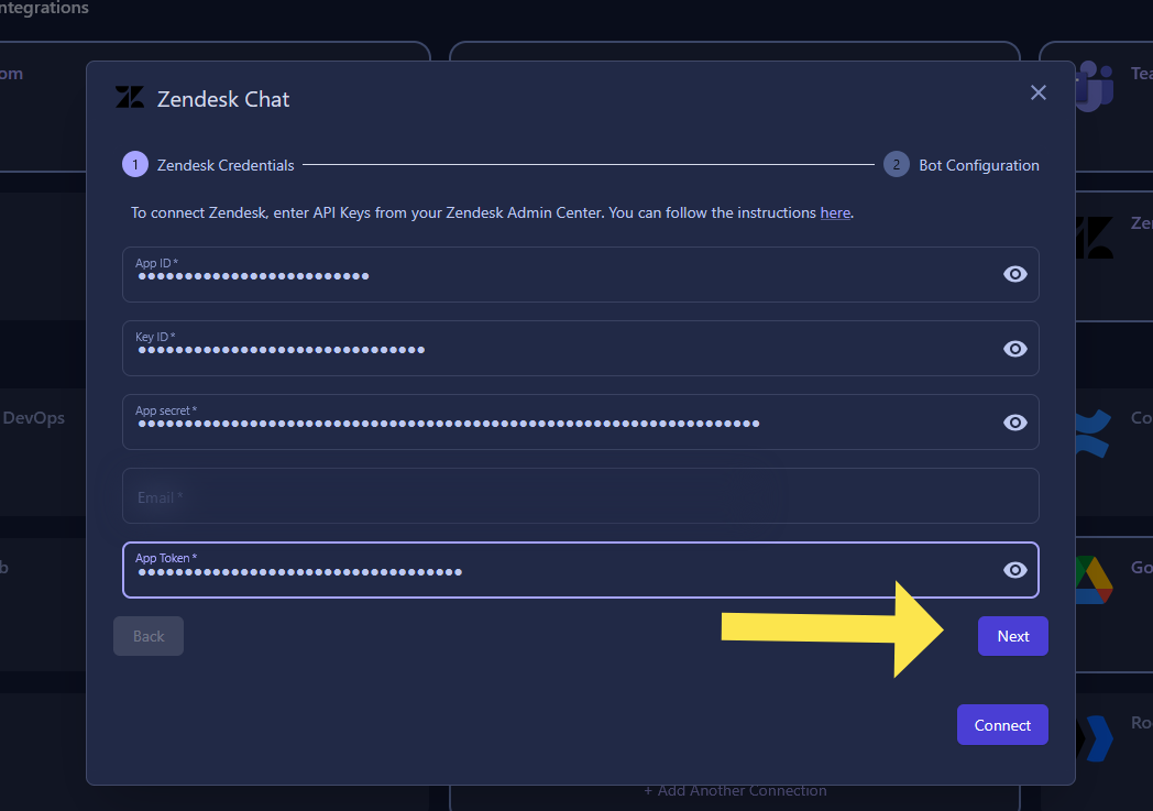 - Paste all four values (App ID, Key ID, Secret, and API Token). Also, enter the Zendesk admin email address and click Next.