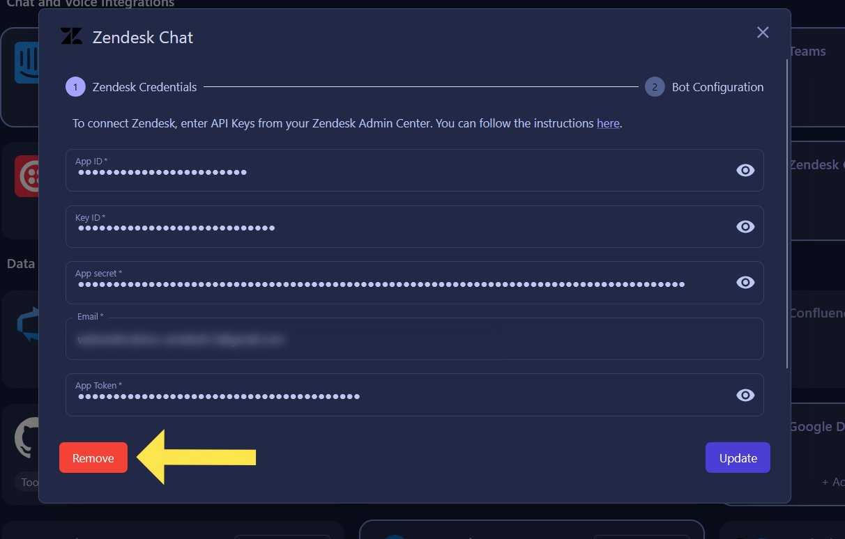 - After successfully uninstalling the bot from Zendesk Marketplace Bots, you can now safely remove the integration from your BotDojo account. Go to your BotDojo account > Integrations, find the Zendesk Chat integration, and click Remove. This integration will now be successfully removed from Zendesk Admin Center as well as from the BotDojo account.