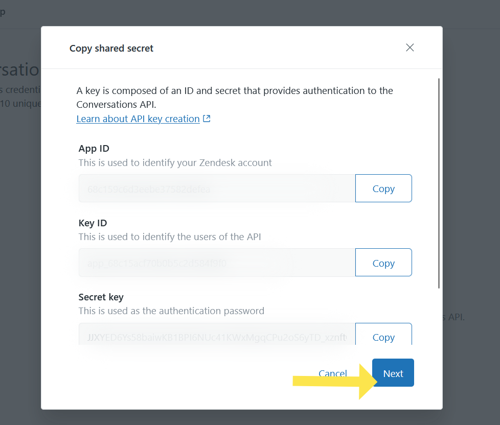 - Copy all three values (App ID, Key ID, and Secret Key) and click Next